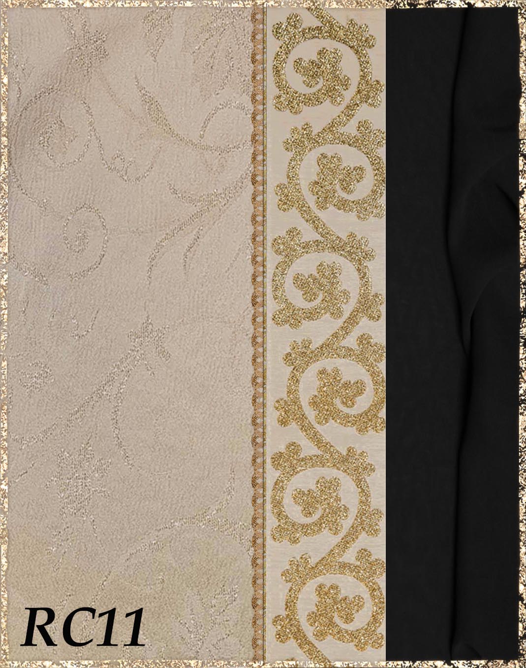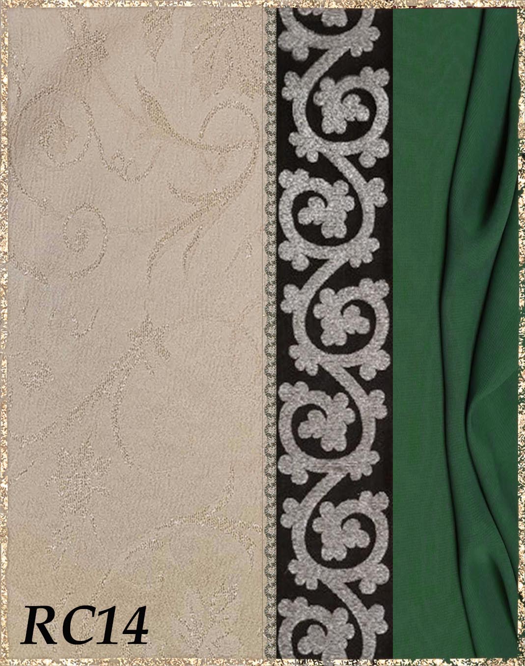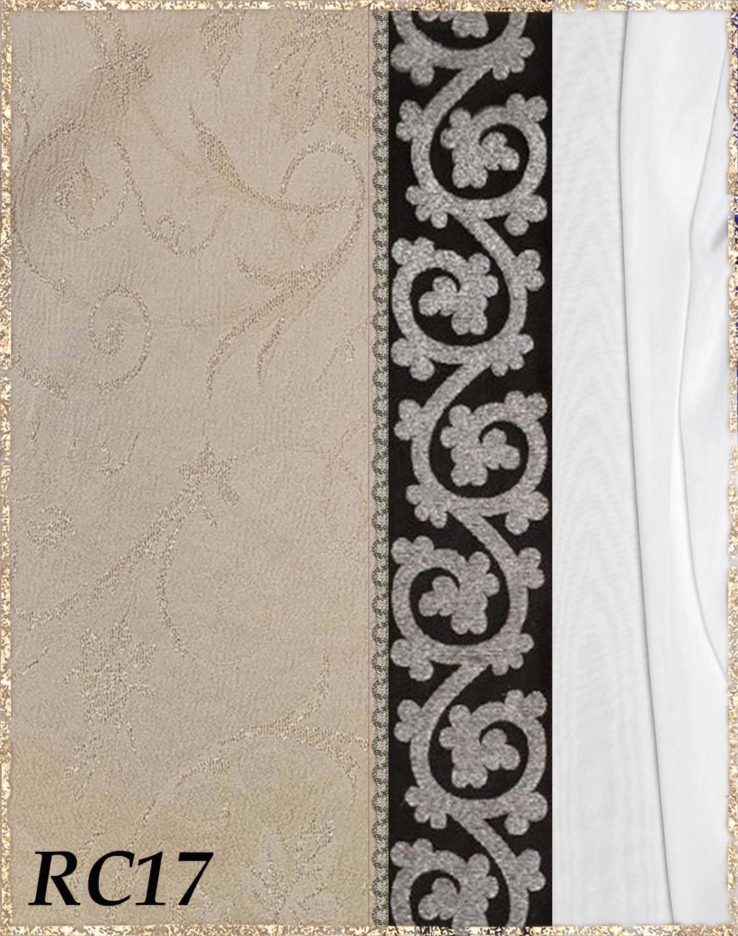 Farbvarianten: Die linke Seite des Farbbildes beschreibt immer die Farbe/das Muster des Kleides (hier immer Rankenjacquard), die rechte Seite die Farbe des Chiffon aus dem der superweite Ärmel und der lange eingezogene Schal besteht. Die Borten sind größenmäßig vergleichbar mit der Modellborte. Andere Kombination gewünscht? Wähle das "?"