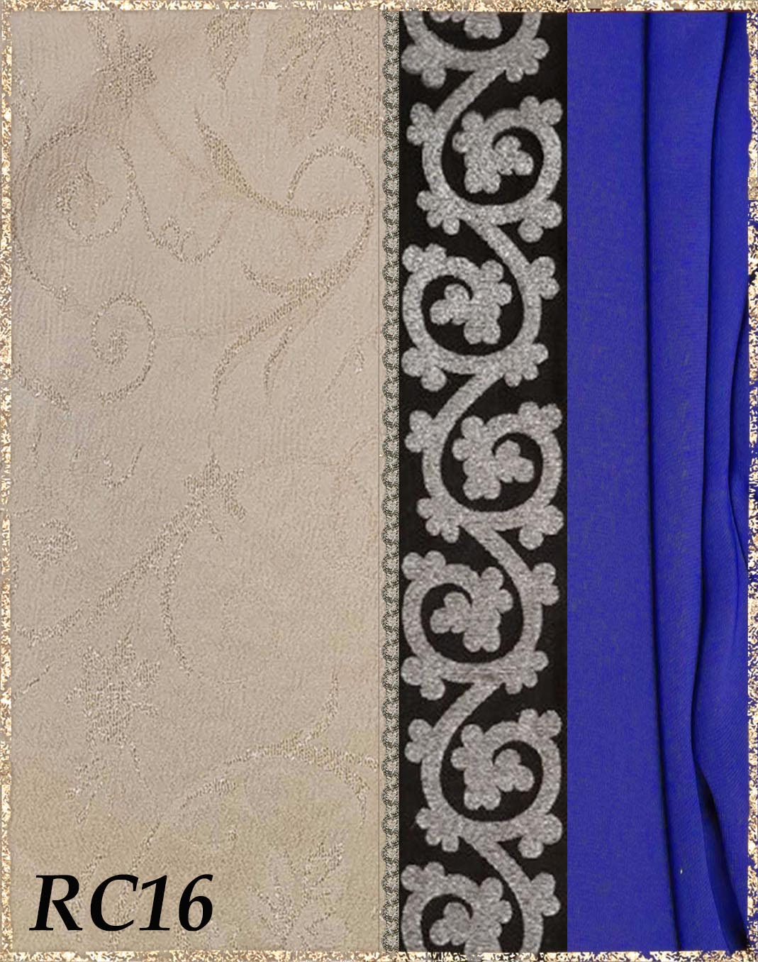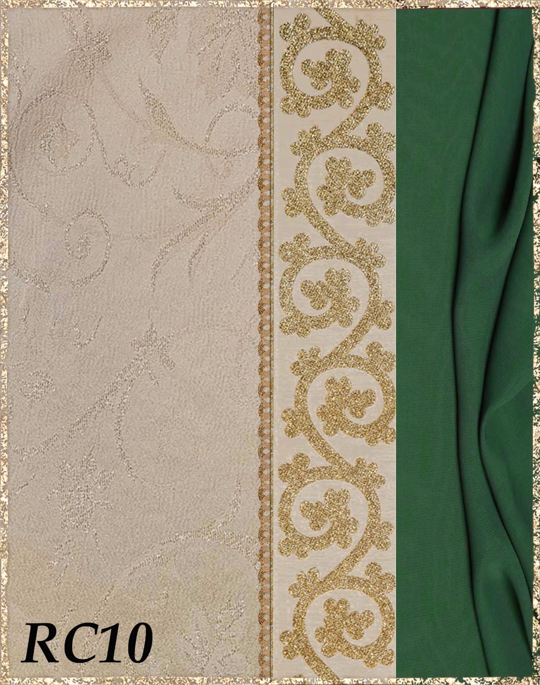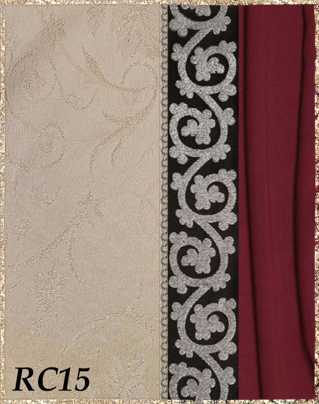Farbvarianten: Die linke Seite des Farbbildes beschreibt immer die Farbe/das Muster des Kleides (hier immer Rankenjacquard), die rechte Seite die Farbe des Chiffon aus dem der superweite Ärmel und der lange eingezogene Schal besteht. Die Borten sind größenmäßig vergleichbar mit der Modellborte. Andere Kombination gewünscht? Wähle das "?"