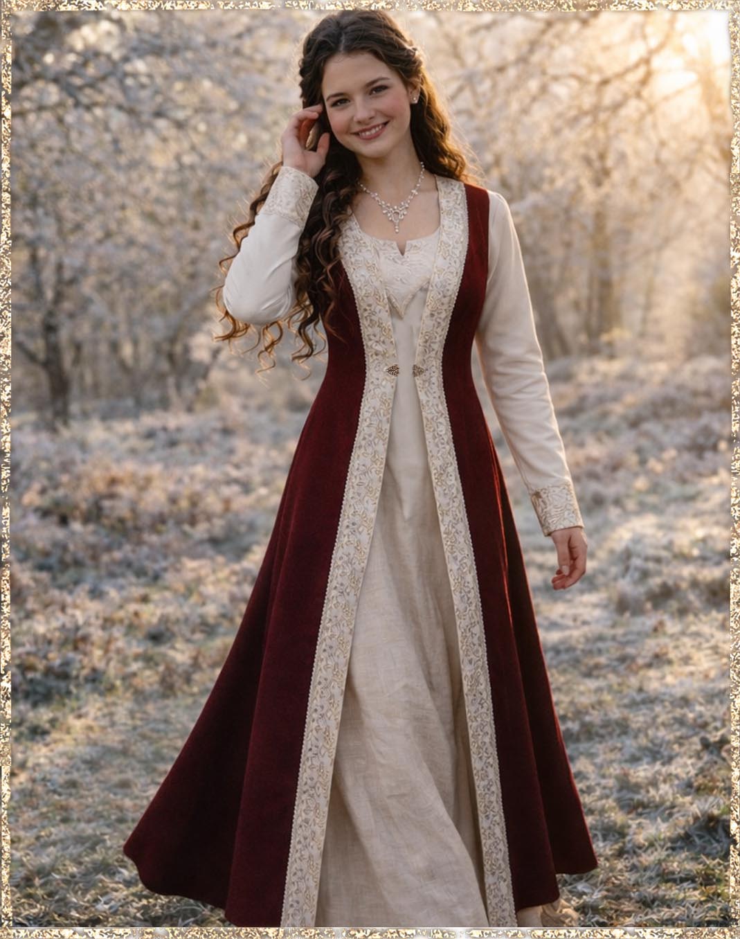 Das Kleid „Sharrah“ ist eine noble, unaufdringliche Kombination für eine Dame mit Anspruch an Stil und Wirkung. Es vereint Authentizität mit einer ruhigen Eleganz und eignet sich hervorragend für festliche historische Anlässe.