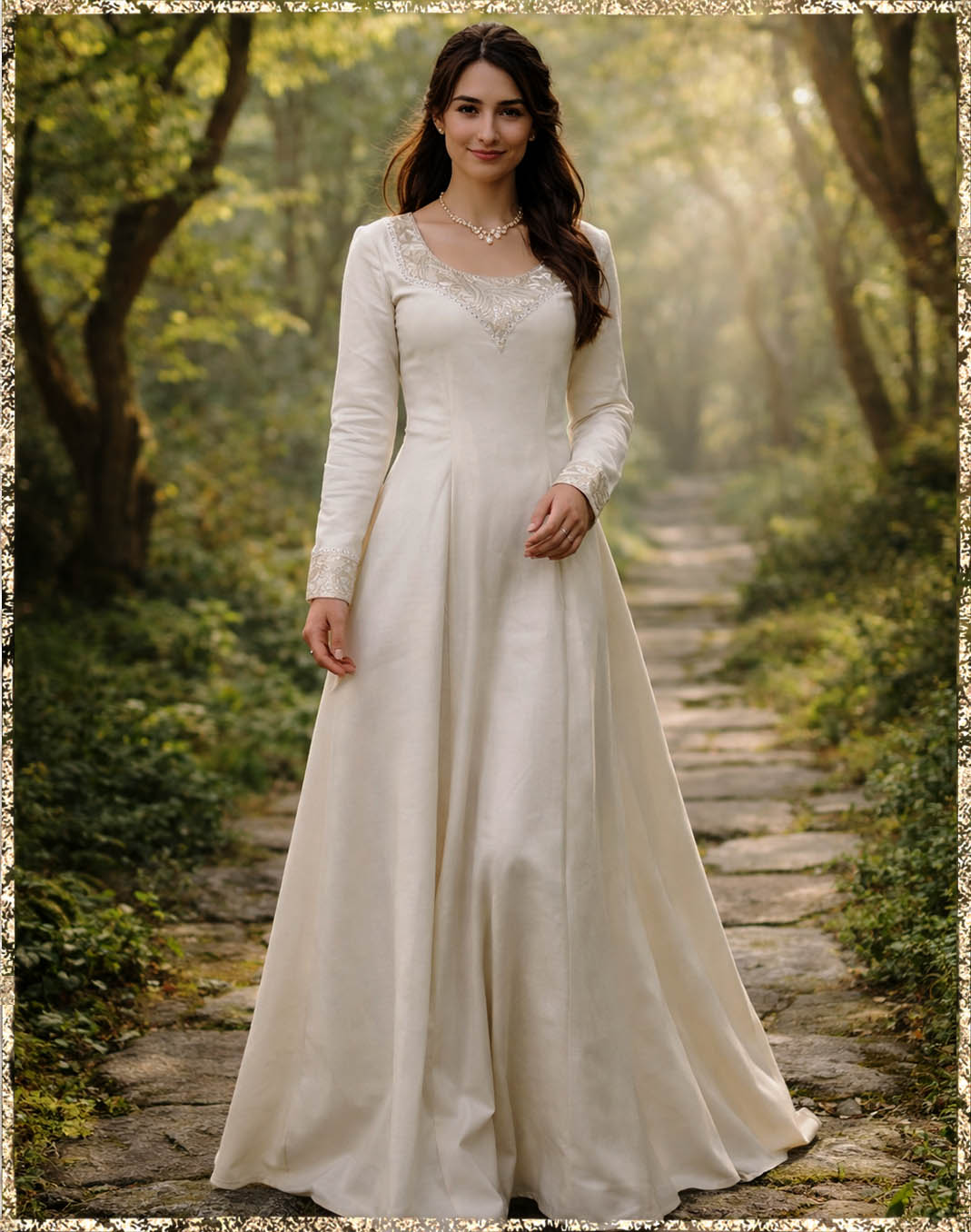 Erlebe mit unserem Brautkleid Sina eine Symbiose aus puristischer Eleganz und herrschaftlichem Glanz. Dieses exklusive mittelalterliche Brautkleid besticht durch seine zeitlose Silhouette und die Verwendung erlesenster Materialien, die wir speziell für dich ausgewählt haben.
