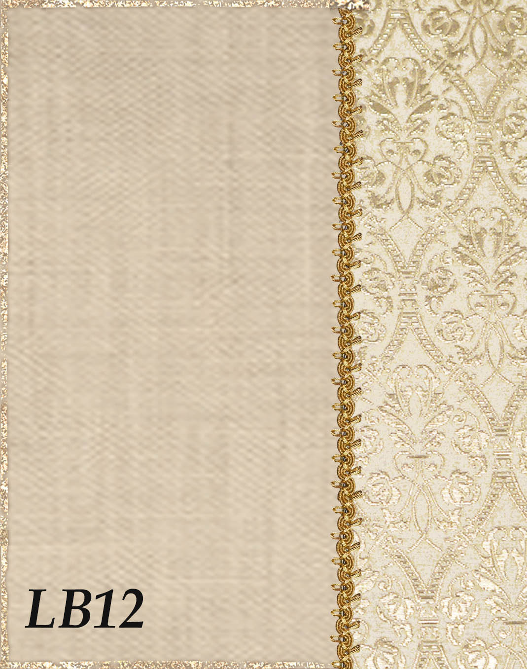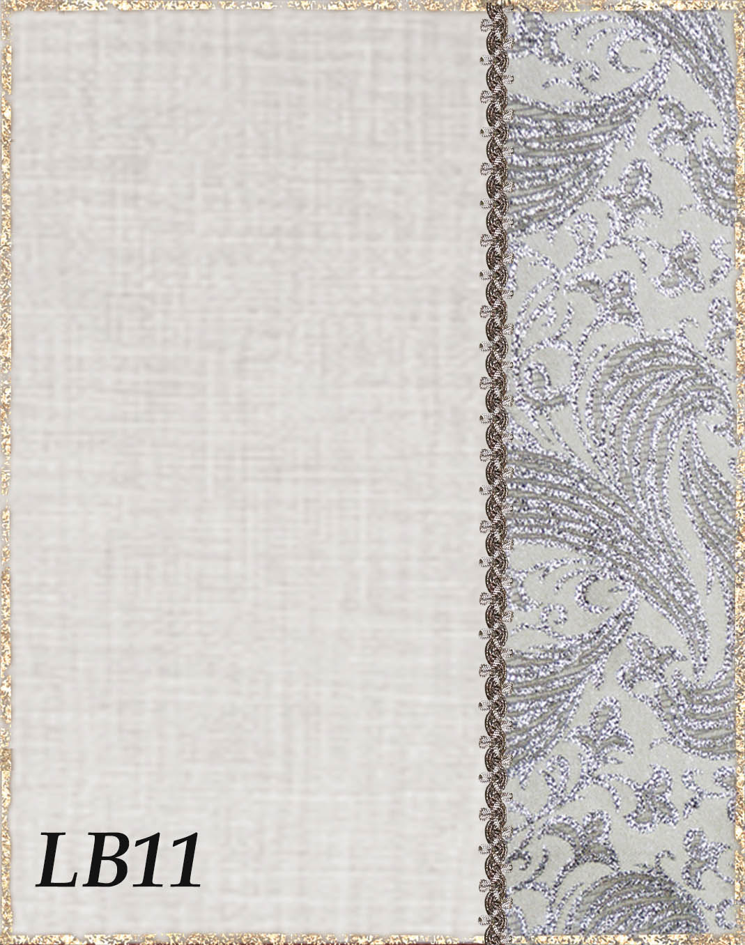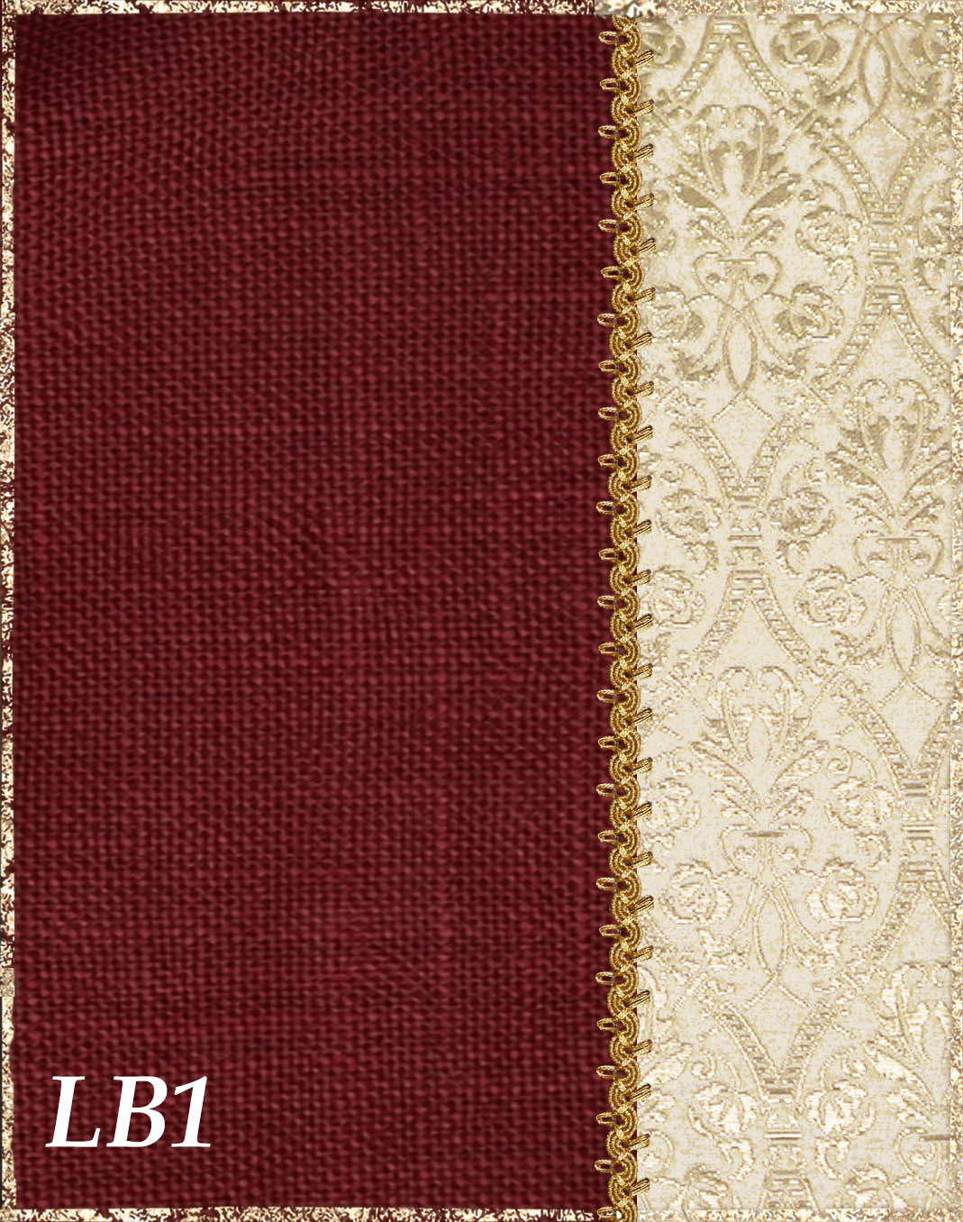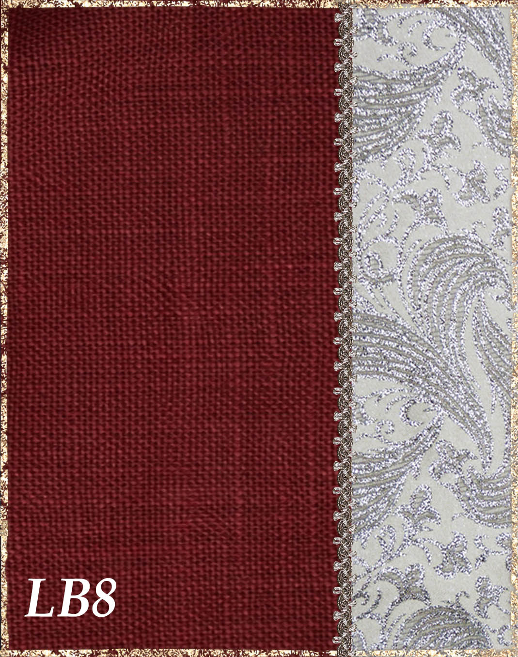 Farbvarianten: Die linke Seite des Farbbildes beschreibt immer die Farbe des Gewandes aus Leinen, die rechte Seite die Farbe des Brokates an Hals- und Ärmelbeleg. Borte und Brokat sind größenmäßig vergleichbar mit der Modellborte.