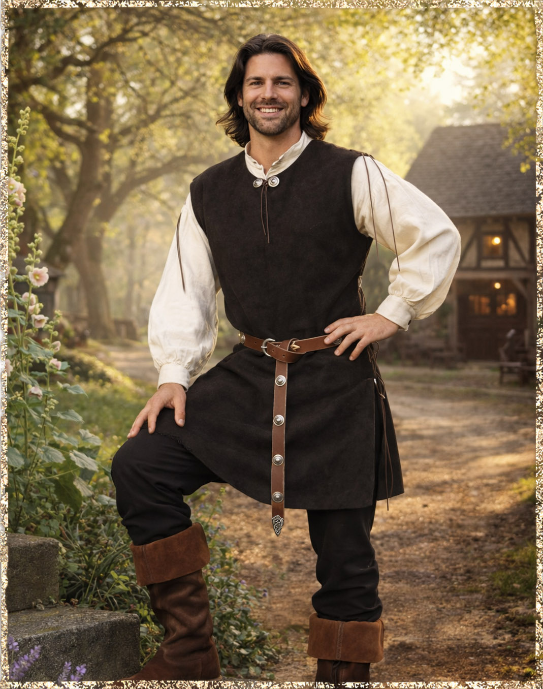 Das Lederwams „Balian“ wird aus echtem, hochwertigem Wildleder gefertigt und wirkt robust, maskulin und kampferprobt. Das angeraute Rindsleder verleiht dem Gewand eine authentische, wilde Optik und hohe Strapazierfähigkeit.