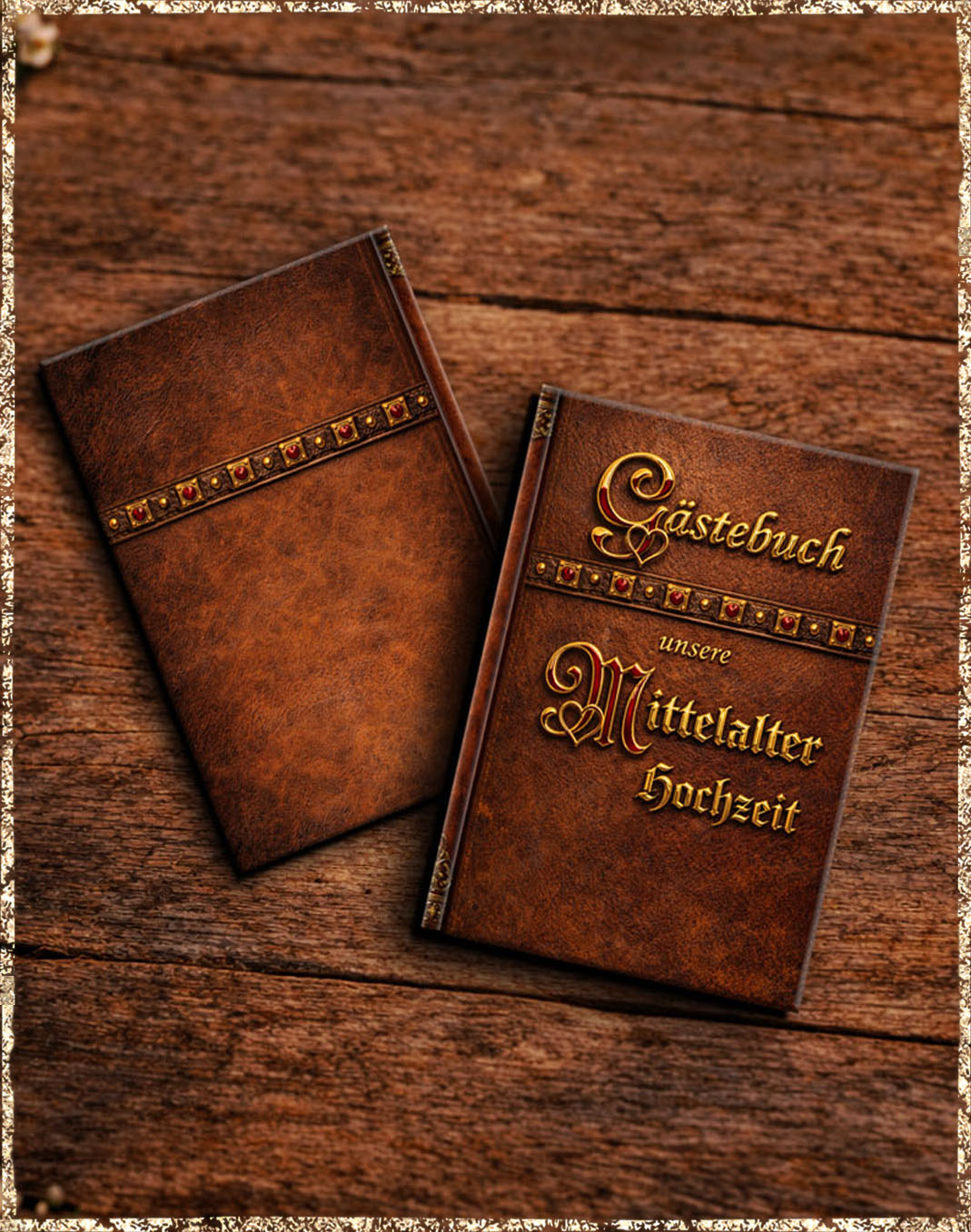 Ein edles Gästebuch für eure außergewöhnliche Hochzeit in Antiklederoptik mit altgoldener Ornamentik.