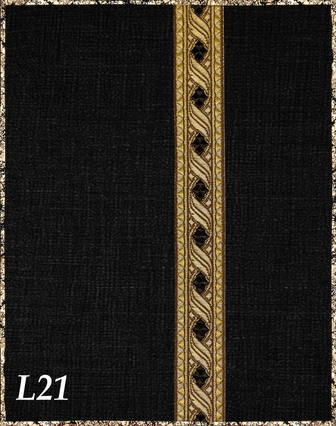 Die halblangen, weit geschnittenen Ärmel, die seitlichen Schlitze und die goldenen Brokatborten verleihen der Tunika eine herrschaftliche Wirkung bei zugleich hohem Komfort. Der Schnitt bleibt klar und tragbar, ohne an Präsenz zu verlieren.