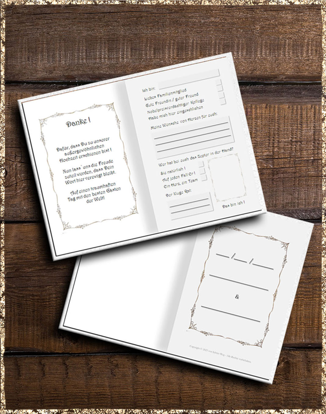 Ein edles Gästebuch für eure außergewöhnliche Hochzeit in weißer Lederoptik mit goldenen Ornamenten.